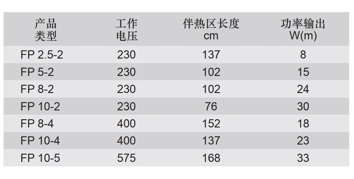 FP并联电阻恒功率伴热带设计用于管道、储罐以及设备的防冻和工艺温度维持。对于这种并联电阻配置,使用赛盟提供的易用套件,裁断所需的伴热带长度,现场端接即可。不管回路有多长, FP伴热带都能够提供一致而又稳定的热量输出。由于FP伴热带与自调控伴热带不一样,它不会受到浪涌电流的影响,因此,不需要超大型的配电装置。FP伴热带适合根据ATEX指令和IEC Ex方案的要求在普通(无分类)场所和潜在爆炸性环境中使用。
